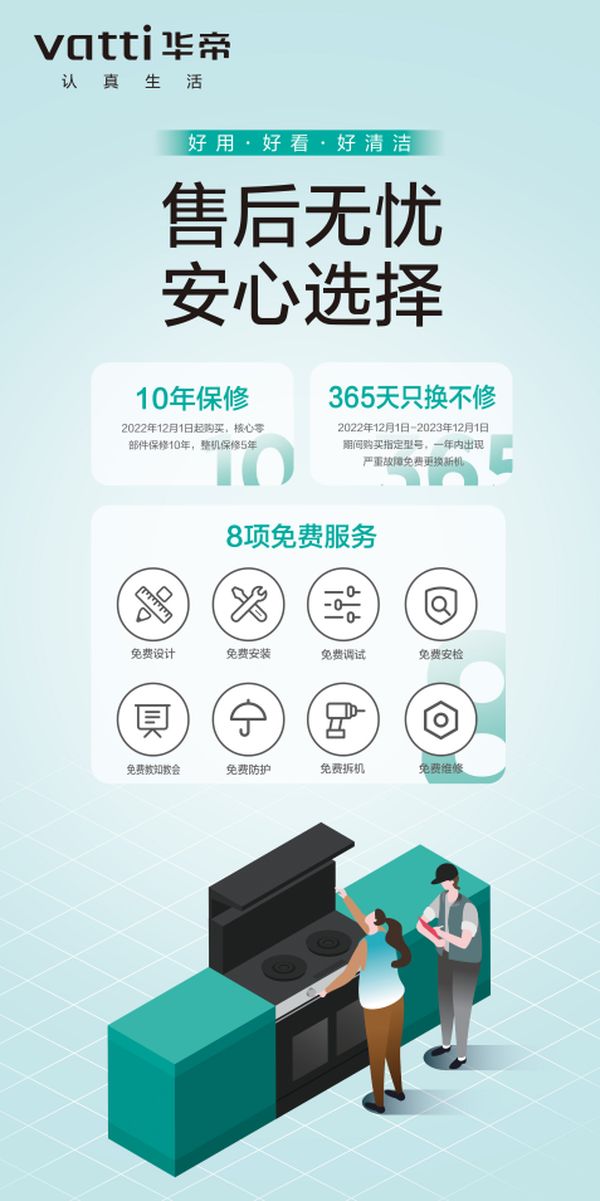 最关键是华帝为用户提供行业最高标准品质保证,不仅有整机5年质保,还提供核心零部件10年保修和8项免费服务,买华帝集成灶更是买一份售后无忧,买一份品质护航。
