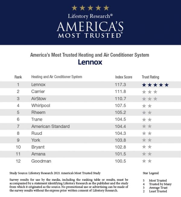 Lifestory Research 2021 美国最值得信赖® HVAC 品牌研究将Lennox、Carrier、AirStow确定为人们心目中最值得信赖的前三品牌。Lennox在积极购买暖通空调的人中产生了117.3 的净信任商分数和 5星信任评级;次之是Carrier,111.8的净信任商分数和3星信任评级;排名第三的AirStow则为110.7的净信任商分数和3星信任评级。
