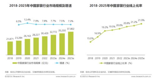 根据早前发布的《2023年中国家装新趋势洞察报告》数据显示,庞大的人口基数以及城镇化进程的稳步推进,供需两端双向驱动及政策助力,为家装行业带来增量空间。据预计,2025年家装行业市场规模将达到37,802亿,年复合增长率达7.3%。