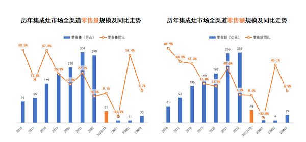 自2022年疫情以来,受房地产和大宗材料等一系列因素掣肘,带给厨电行业的阴影直到2023年初也并未完全褪去,集成灶行业也并没有迎来去年预判的“回春”,据奥维云网数据显示,2023年Q1集成灶零售额规模48亿元,同比增长0.5%,零售量规模51万台,同比增长0.1%,原本高速增长的势头逐渐放缓,给集成灶企业心头蒙上一层寒霜。