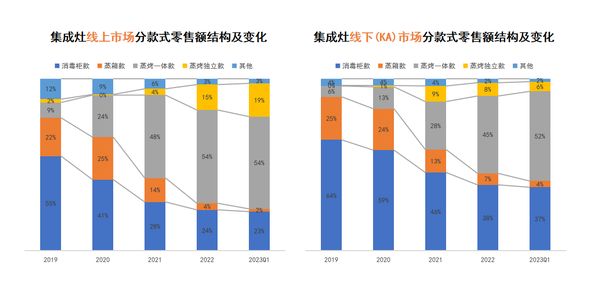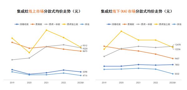 同时,还有市场价格的不断下探也给部分企业带来了压力,据奥维云网(AVC)1-2月数据显示,集成灶万元以下市场出现短期增长,2023年1-2月集成灶线上万元以下产品零售额占比为57%,同比增长4%;线下万元以下市场零售额份额为43%,同比增长1%。