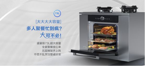 在美食创作上,年轻人更倾向于非明火烹饪,你只需准备好食材设定好程序,全由灶蒸烤一体机自动完成。省下来的时间可以休息,或与闺蜜、亲朋聊天畅谈增进情感。更为重要的是,它能解锁你更多的烹饪技能,以前不曾涉猎或不敢轻易发起挑战的美食,有了灶蒸烤一体机你都可以轻松达成,让朋友投来羡慕的目光。以老板高性能集成烹饪中心为例,其匹配的高端灶蒸烤一体机,借助自研的【加汽旋转烤】功能,上色均匀外酥里嫩,在家就可以烤羊排、烤大块羊肉串等当季最1受欢迎的美食,要多好吃有多好吃,一点不输外面的大排档。在容量上,它还提供了盛宴级73L超大容量,配合五层搁架,让家庭聚餐、朋友聚会不再慌乱,一次搞定整桌好菜。不止如此,变频大蒸汽系统、无油空气炸、蒸烤多段组合样样全能,还能让你充分发挥才艺,成就大师级烹饪手艺。