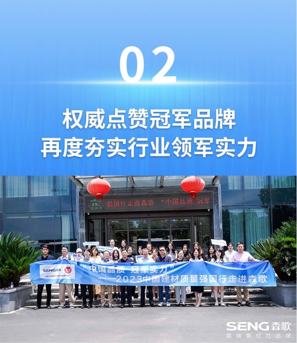 2023中国建材质量强国行旨在展示一大批质量过硬、优势明显的中国家居头部品牌。森歌作为质量强国行的首发品牌,在此前便获得了行业领军品牌和国货之光的荣誉,本次活动,在各路权威代表组成的参观团高规格的“检阅”下, 森歌再次展示出了冠军制造实力。