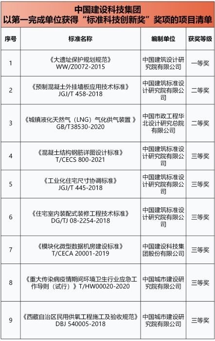 作为第二完成单位,中国建筑设计研究院有限公司主编的《建筑与工业给水排水系统安全评价标准》(GB/T51188-2016)、中国建筑标准设计研究院有限公司主编的《绿色住区标准》(T/CECS377-2018,T/CREA001-2018)荣获一等奖,中国建筑标准设计研究院有限公司主编的《Doors,windows and curtain walling-Curtain walling-Vocabulary》(ISO 22497)荣获二等奖,中国建筑标准设计研究院有限公司主编的《民用建筑电气设计标准》(GB 51348-2019)荣获三等奖。