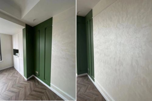 第五步:渗透型底漆施工完成后,滚涂衔接型底漆。对比市场上常见的一遍底漆工序,米素采用双底漆,提高了艺术漆与墙面的结合力,能有效避免墙体起皮脱落。