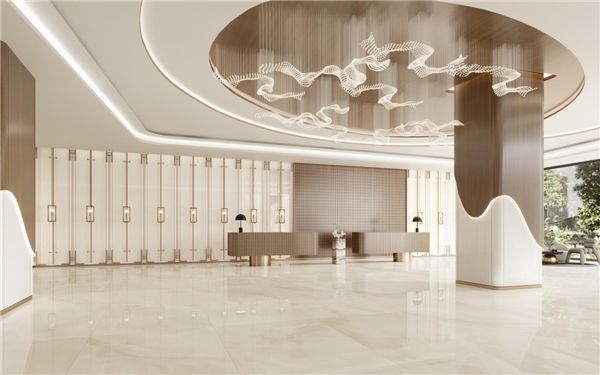 当你踏入这个大堂空间时,首先会被暖色调的珍珀黄所吸引,这种色彩的运用使得大堂醒目和引人注目,为人们带来一种活力和欢迎的感觉。为了增加空间的奢华感,金属点缀被巧妙地运用在大堂的装饰元素中,整个空间充满了轻奢感,带来视觉上的冲击。