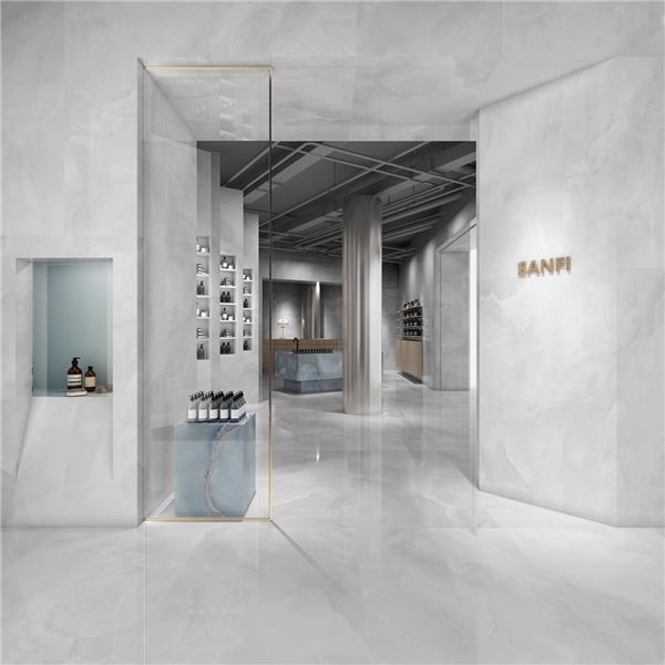 商业空间采用玉镜·皓羽白通铺,赋予了整个空间玉石质感,通透又高级,明亮而纯净,青山蓝与淡原木棕的适当点缀起到了平衡和装饰的作用,为整个空间增添了一丝清新和活力,简约的廓形、利落的几何线条,让空间刚柔并济,充满轻奢感,刻画独具风格的优雅。