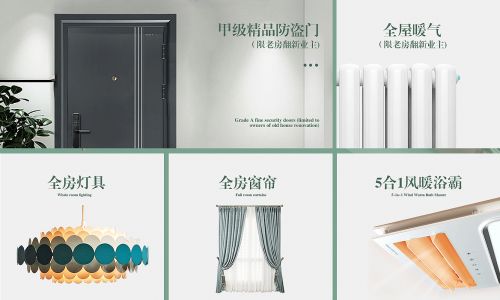 第二重建材礼:全包圆家装将为客户提供全房灯具、全房窗帘以及5合1风暖浴霸。对于老房翻新的客户,更可专享甲级精品防盗门和全屋暖气片的焕新服务,为您的家居安全和舒适提供全方位的保障。