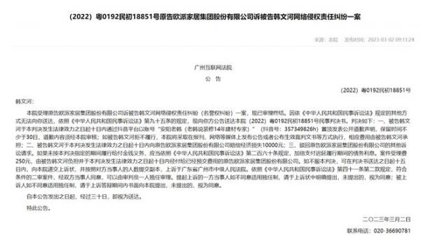 2023年3月,韩某某败诉。南方都市报对该事件的报道中引用了一份3月2日的法院公告,在这个名为《原告欧派家居集团股份有限公司诉被告韩某某网络侵权责任纠纷一案》的公告中,韩某某因网络侵权,被判定在抖音平台以账号“安阳XX”置顶发表公开道歉声明,保留时间不少于30日,并判决韩某某向原告欧派家居集团股份有限公司赔偿经济损失一万元。