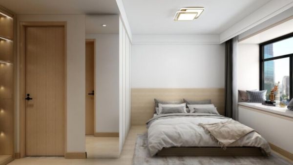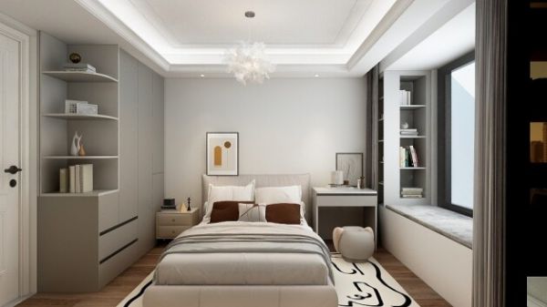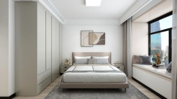 卧室是主人放松的私密空间。一柜到顶的智能衣柜是空间的亮点,搭配着柔软舒适的床上用品,营造和谐的视觉效果。窗帘选择自然灰调的布料,让清晨的阳光温柔地透过。