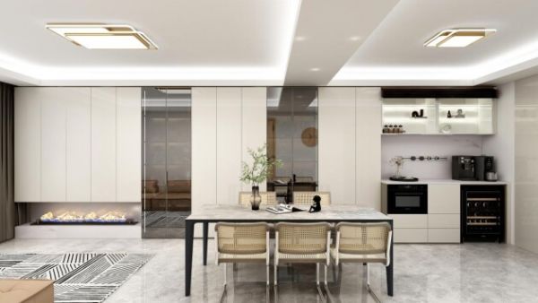 考虑生活动线,餐厅的位置一般都在离厨房较近的地方,方便传菜、就餐,常见的位置,就是在厨房门口。
