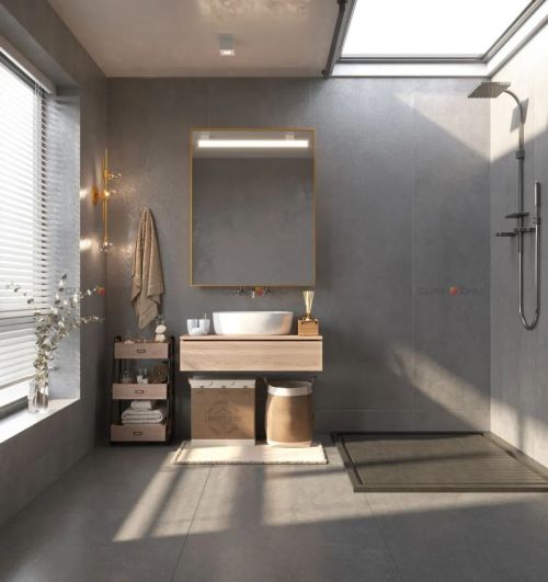 卫生间采用冠珠境界石西慕水泥格拉尼特-浅棕,通铺墙面地面,很好的形成统一的视觉效果,微水泥风有着内敛沉稳的气质,让空间格外静谧舒适,晚上回家来一场沉浸式泡浴,瞬间卸掉一身疲劳。