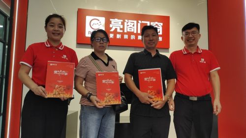 期间,他们一直在联系亮阁门窗的招商经理(兰经理和刘经理),邀约之下来到亮阁门窗总部旗舰店参观,对亮阁门窗的产品款式、设计研发还有公司的企业文化都比较感兴趣,但当天还没有做下决定!