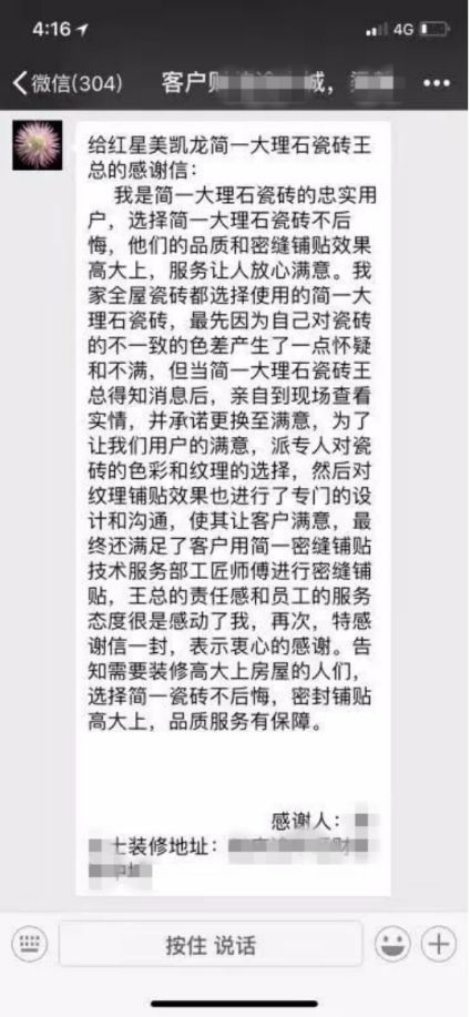 把复杂留给自己,把简单留给用户。在对待消费者上,简一讲究的是真诚,用真心换真心,把客户的房子当成自己的房子来看待,也正是在用户服务上的孜孜以求,简一不断收获来自用户的认可与好评,一封封饱含真情的表扬信切实体现出了客户服务的真谛——“你为所做的,用户都会看在眼里、记在心里”。正如简一挚友,目前国内登顶珠峰最年长女性陈旻在采访中所言:“简一的产品温度不是触摸到的物理温度,而是精神归宿和人文情怀,瓷砖里面承载简一的匠心与温度。”