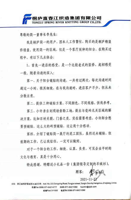 一封封表扬信、一面面锦旗、一次次为简一活动站台……这些不同形式的感谢方式,都是消费者对简一服务的认可,也是简一持续做好用户服务的动力。在简一看来,用户不仅仅是产品和服务的体验者,更是品牌难得的挚友,简一希望通过服务好用户的美好家建设,建立更深层次的情感链接,相互成就,实现共赢。因此,你会看到在业主群,用户对简一服务真诚的点赞;在活动现场,简一挚友向更多消费者推荐简一。以真诚为宗旨,以真心换真心,简一与用户共情共鸣。