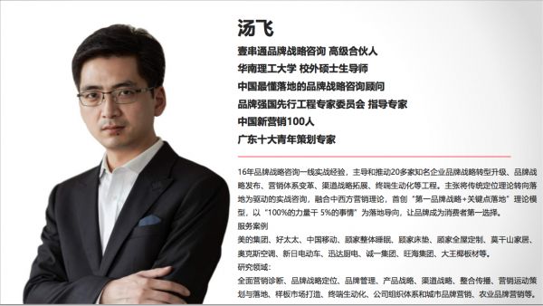 在16年品牌战略咨询的职业生涯里,汤飞先生服务了美的集团、好太太、中国移动、顾家整体睡眠、莫干山家居、顾家床垫、顾家全屋定制、奥克斯空调、新日电动车、迅达、诚一集团、旺海集团等多行业多领域知名品牌(更多信息搜索:汤飞公众号)。