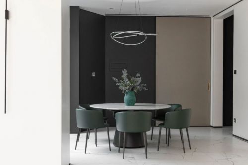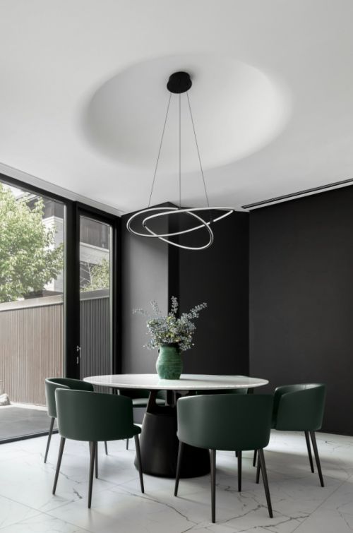 来自CAMERICH锐驰的「家宴」圆桌,搭配清爽的墨绿色BALLET芭蕾椅,圆锥体底座极具雕塑质感,看似纤薄的大理石桌面,如同湖水的一晕,荡漾开来……带给人身心愉悦的感官体验。轻盈与厚重、方寸与圆满、开阔与收敛,让人如同置身山水石间的影影绰绰,清净悠远自来。