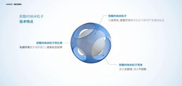 既然如此,耐酷时攻克的技术难点就在于如何解决光触媒不能直接用于纺织物这一问题。耐酷时纳米粒子的外部有一个核壳结构,将其与载体有机物进行有效隔离,避免了光催化材料光腐蚀窗帘、墙布的问题,且核壳结构上的孔隙提供了良好的储水环境,既不会像传统光触媒那样遇水团聚,同时也加速了光催化反应效率。