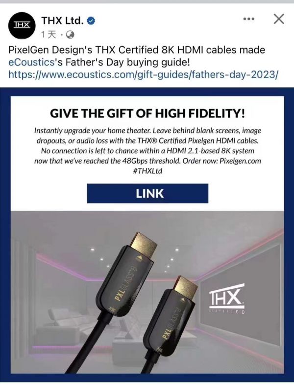 近期,THX粉丝大喜过望!THX官推发布重磅联名款HDMI认证产品——可以用作父亲节礼物的Pixelgen超级HDMI线!黑金配色彰显孤高精奢!震撼登场!是的,THX终于对高规格HDMI下手了,饱经THX官方极力推荐,甚是大手笔!