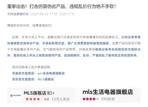 其中,照明头部企业木林森旗下控股子公司木林森健康科技于8月2日发布推文称,近期在各大线上平台,频繁出现不法商家利用木林森健康科技的品牌名义,以非正常零售价格销售仿冒伪劣产品、不良品和残次品,并接连查到有部分账号未经公司官方授权允许,擅自在线上平台上架售卖其产品,且违规降价、乱价,严重扰乱了木林森健康科技的正常经营秩序。