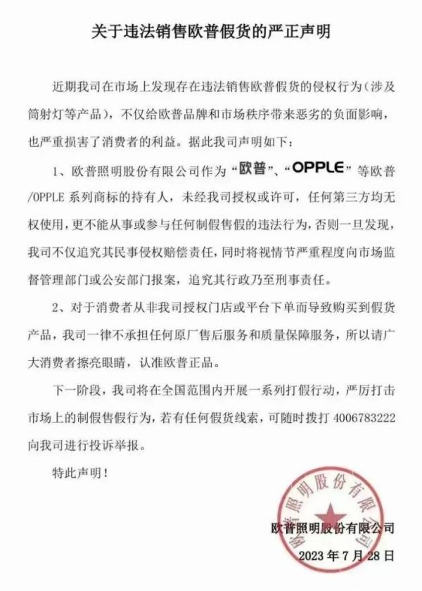 7月28日,欧普照明发布一则《关于违法销售欧普假货的严正声明》。声明指出:近期我司在市场上发现存在违法销售欧普假货的侵权行为(涉及筒射灯等产品),不仅给欧普品牌和市场秩序带来恶劣的负面影响,也严重损害了消费者的利益。