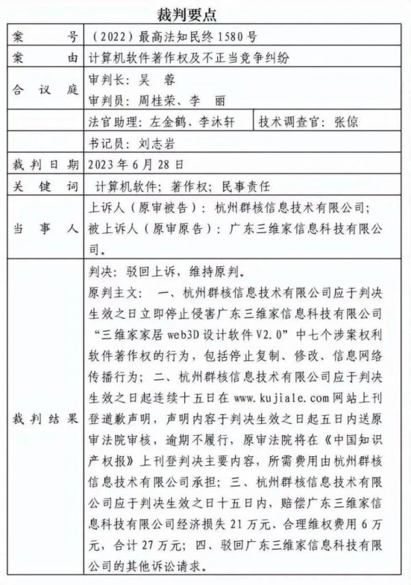 今年7月消息,最高人民法院近日就广东三维家信息科技有限公司(以下简称“三维家”)诉杭州群核信息技术有限公司(以下简称 “酷家乐”)侵害计算机软著作权及不正当竞争纠纷案作出终审判决。