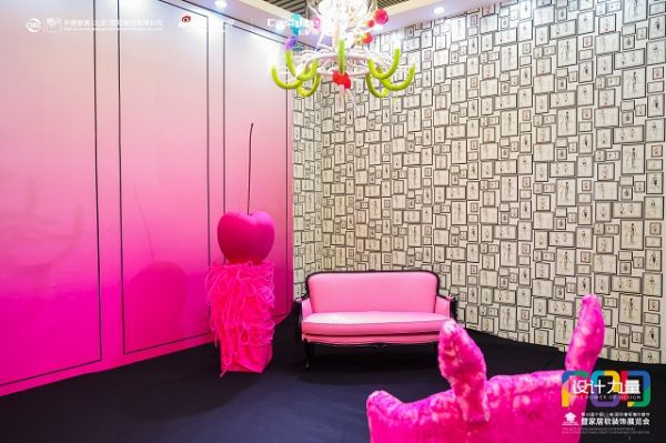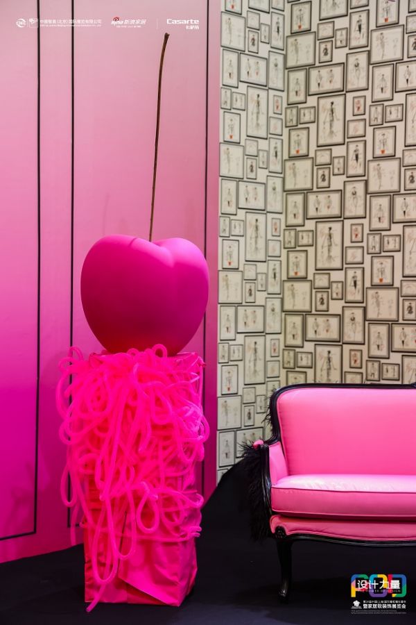 【朱朱】:这次展会我们是在软装馆里,软装馆里会有一些壁纸、窗帘板块,我其实是先选择了一款壁纸,它的主题是小黑裙。小黑裙是奥黛丽·赫本的经典的,几十年的一个银幕形象,被演绎地非常优雅。其实,每一个女人心目中都有一件自己的小黑裙,爱美的女生的家具里也会有一个小黑裙的角落,所以我就设计了一个以小黑裙为主题的一个小空间。空间加入了今年很流行的多巴胺色渐变玫瑰粉,也就是所谓的死亡芭比粉。这其实是希望人们在疫情后,能治愈自己的某一个部分。