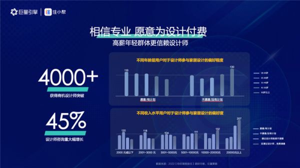 从家居家装消费人群上看,80后、90后为主家居家装消费人群,更习惯通过内容平台、APP等线上渠道获取家居信息;也更看重整装和居住的舒适性,且高薪年轻群体更愿意为设计付费。在2022年,住小帮端内收获线索咨询的设计师就超过约4000个,而2023上半年其咨询体量更是同比提升45%。