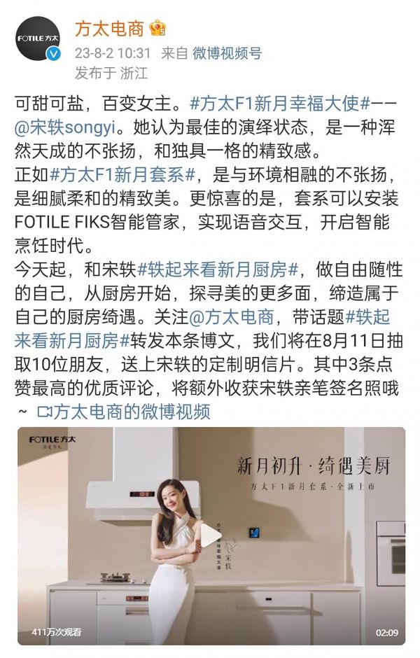 为进一步强化方太F1新月套系与宋轶的契合度,将传播价值发挥到最大化,除了引发共鸣的产品影片外,方太还构建了微博、小红书、抖音等多话题、多矩阵式流量阵地,筑牢“从粉丝圈层辐射至路人圈层”的传播根基,从而长效驱动站外意向流量向方太电商各大平台转化的链路闭环;互动层面,方太深究F1新月套系背后的新时代女性价值观,并巧用宋轶明信片、宋轶联名定制周边等福利与潜在消费者做更深度的链接,深层次实现产品、明星与粉丝的三方共振,最大程度撬动更多年轻消费者的关注与喜爱。