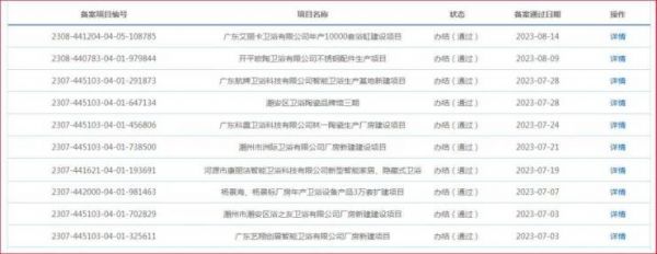 厨卫君从广东省投资项目在线审批监管平台查询看到,从2023年7月1日到8月15日,已经通过备案项目公开的、与卫浴产能扩建相关的项目已经有10个,合计投资总额超过6亿元,主要分布在潮州、中山和江门等地,包括智能卫浴产品、浴缸、卫浴配件等产品。