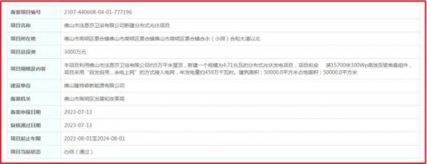 在备案公开的光伏项目中,投入较大的为“佛山市法恩莎卫浴有限公司新建分布式光伏项目”,该项目总投资计划3000万元,利用佛山市法恩莎卫浴有限公司约5万平米屋顶,新建一个规模为4.71兆瓦的分布式光伏发电项目,项目拟安装15700块300Wp高效双玻单晶组件,项目采用“自发自用,余电上网”的方式接入电网,年发电量约459万千瓦时。