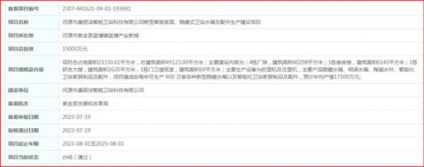 其中,投资金额较大的为“河源市康丽洁智能卫浴科技有限公司新型智能家居、隐藏式卫浴水箱及配件生产建设项目”,预计投资1.5亿元。从备案公开的信息可以看到,该项目总占地面积23330.61平方米,总建筑面积49123.00平方米。主要生产产品为隐藏水箱、明装水箱、陶瓷水件、智能化卫浴家居制品及配件,项目建成后每年可生产600万套各种新型隐藏水箱以及智能化卫浴家居制品及配件,预计年均产值17500万元。