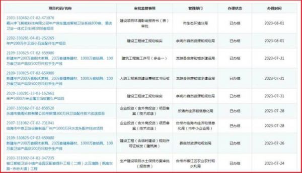据浙江省投资项目在线审批监管平台公开信息显示,2023年下半年至今,多个与卫浴产能相关的项目正在审批或者建设中。例如:嘉兴宇飞智能科技有限公司年产房车集成智能卫浴系统800套、酒店卫浴一体式卫生间3000套项目;乐清市昊阁科技有限公司年新增300万只卫浴配件技术改造项目等。