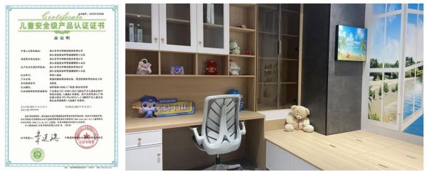 莫干山板材的花色一向选择众多,既有高饱和度的明亮花色,也有低饱和度的深沉花色,儿童房区域整体配色上采用了较为亮丽的颜色,多样化的色彩搭配让空间充满生机。其床铺采用了榻榻米的设计,旋转式抽屉拉手设计有效地避免了小孩夹手的问题。在材料方面,均选用的是莫干山豆茵板,从原材到生产工艺严格把控,拥有“儿童安全级产品认证证书”身份,轻松为孩子们打造“无醛空间”。另外,可以看到儿童房区域有很多的收纳功能,这样的设计可以确保储物空间充足,方便存放孩子们的物品。