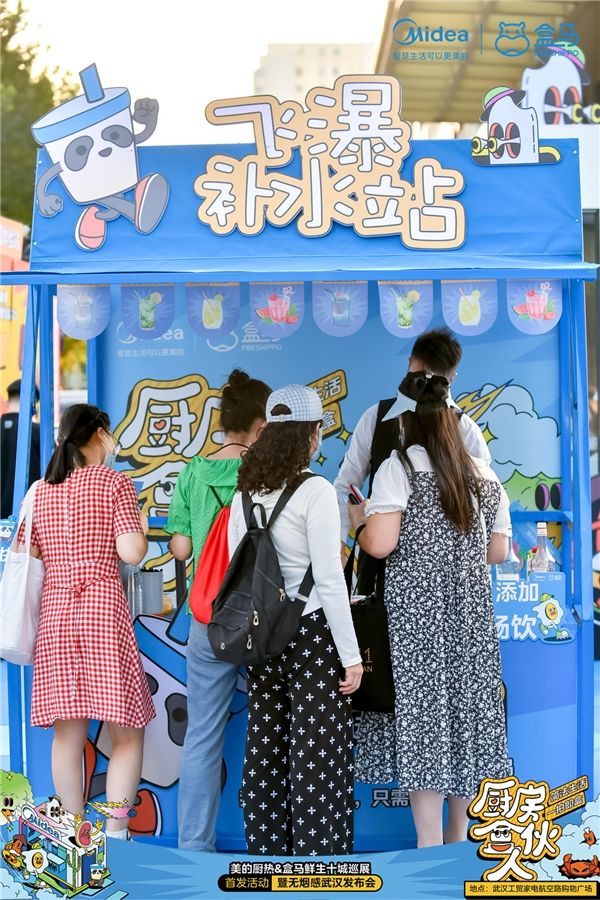 消费者可以在体验铺内拍照打卡、与产品互动;还能在各个站点领取到专属印章,完成收集活动的用户,可于“飞瀑补水站”使用“盒约书”兑换饮品、餐券及礼品,通过健康美味饮品感受到水质净化的生活重要性,同时感受美的净水器产出好水与盒马优质产品。本次活动现场人气火爆,吸引了大量消费者前来打卡,这场沉浸式“饮食自由”打卡活动,为消费者解锁了臻香美好厨房的多种可能,受到了现场一致好评。