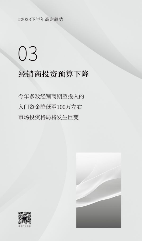 而今年大多数经销商期望投入的入门资金是100万左右,最多不会超过200万。这对整个市场的投资格局来说将会产生很大的变化,这一点也与我们之前提到的第一点呼应。