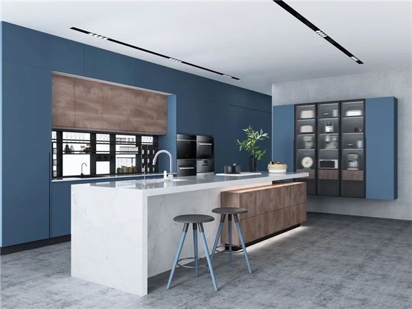 厨房背景墙的云澜系列橱柜格外醒目,苍蓝色的柜体邂逅柔白的台面,低调而有格调,再配合自然纹理的木纹面板,更让人感到亲切自然。