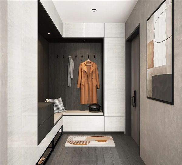 玄关橱柜采用L型设计,深色木纹与白色相接,清新自然。内侧小灯照亮暗处,恰到好处地提升亮度,还营造出朦胧的空间氛围。