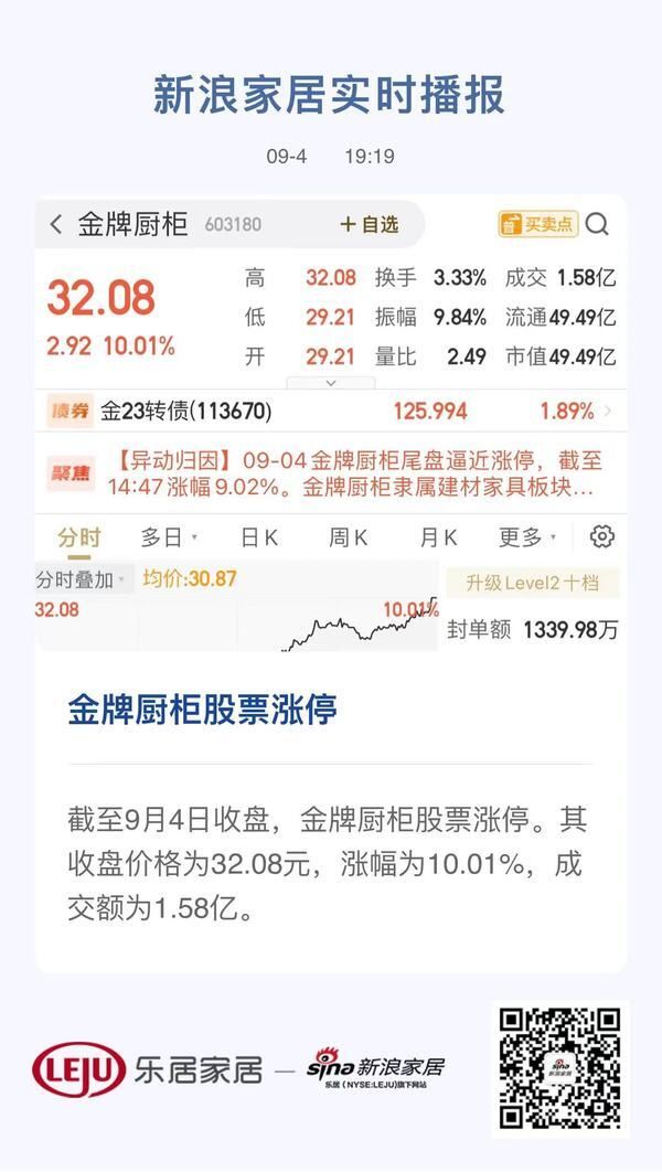 截至9月4日收盘,金牌厨柜股票涨停。其收盘价格为32.08元,涨幅为10.01%,成交额为1.58亿。