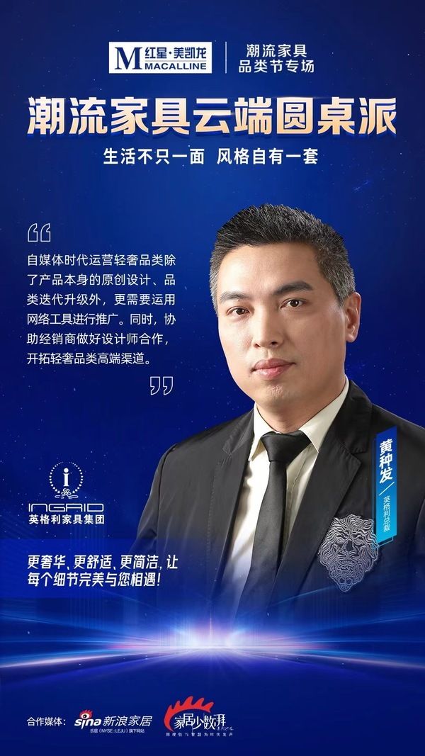 4月28日,由红星美凯龙主办的“潮流家具云端圆桌派”成功举行。活动以“生活不只一面,风格自有一套”作为主题。来自平台、行业头部品牌、权威媒体意见领袖等众多大咖进行深度思维碰撞,探索家具行业新趋势、新潮向。英格利总裁黄种发受邀出席对话论坛,并发表观点。