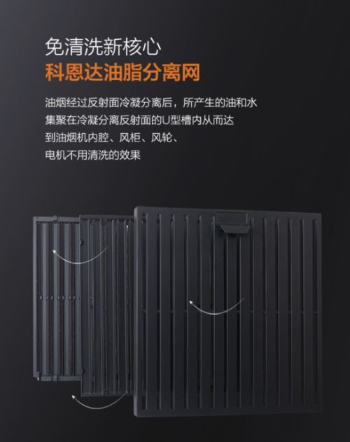 科恩达油脂分离网完美实现烟机免清洗。科恩达油脂分离网可实现高效油脂分离,油脂分离率>96%,实现油脂不进门,烟机免清洗的理想状态。