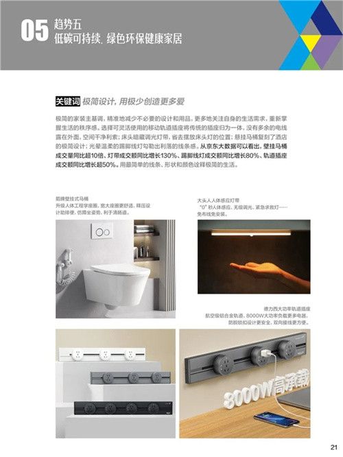 自己动手DIY改造家也成为家装热点,从京东数据可以看出,DIY工具成交量同比增长超80%,越来越多用户有意向DIY改造家。此外,壁挂马桶成交量同比增长超10倍、灯带成交额同比增长130%、踢脚线灯成交额同比增长80%、轨道插座成交额同比增长超50%,越来越多的消费者正在诠释极简生活。