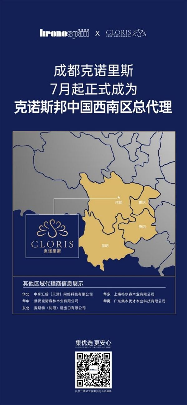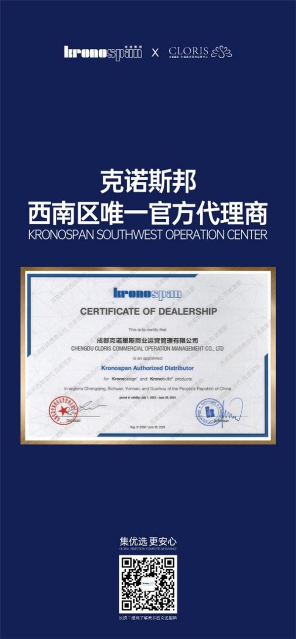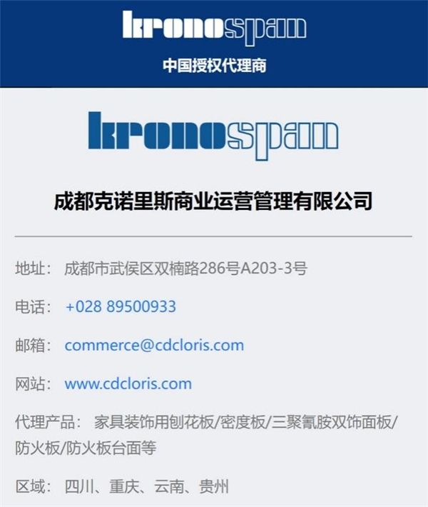 Kronospan克诺斯邦中国官网(http://www.kronospan-china.com)正式更换中国西南地区总代理,新的西南总代理公司名称为成都克诺里斯商业运营管理有限公司。