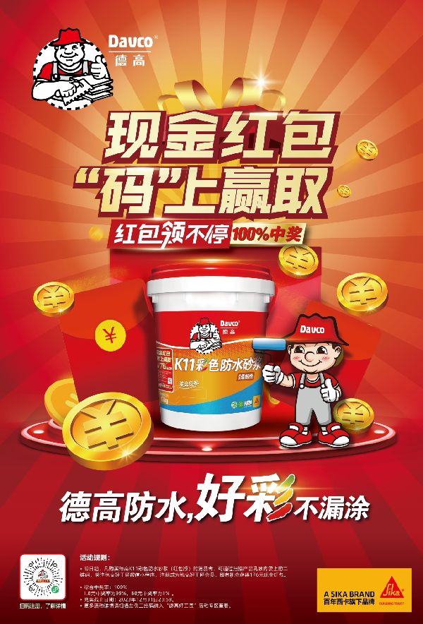 另外,购买德高K11彩色防水砂浆(红包版)的消费者可留意其红包扫码活动,有机会获得176元现金红包!