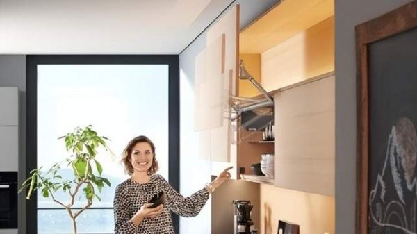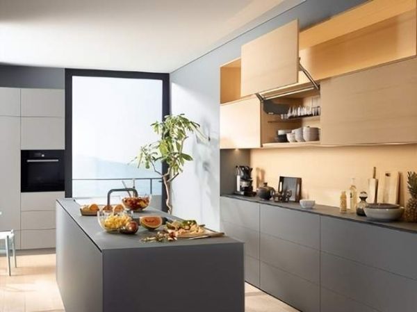 比如百隆的AVENTOS HL上翻平移门就是一款出色的产品,它可以使整块面板平行向上开启,面板完全悬于操作区域的上方,在烹饪的过程中可以一直保持开启状态,能让厨房烹饪更加随心所欲。