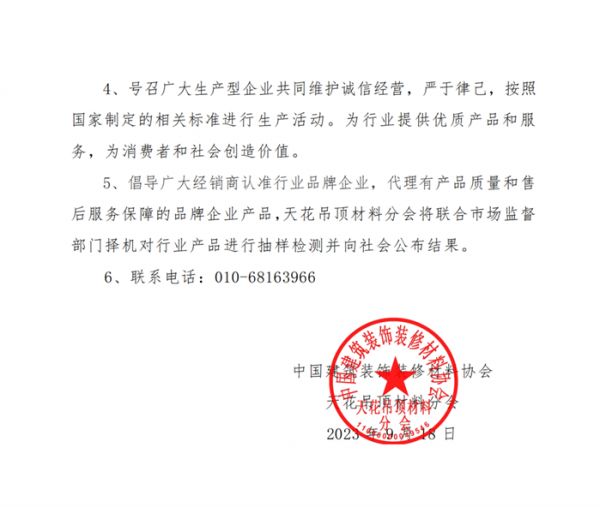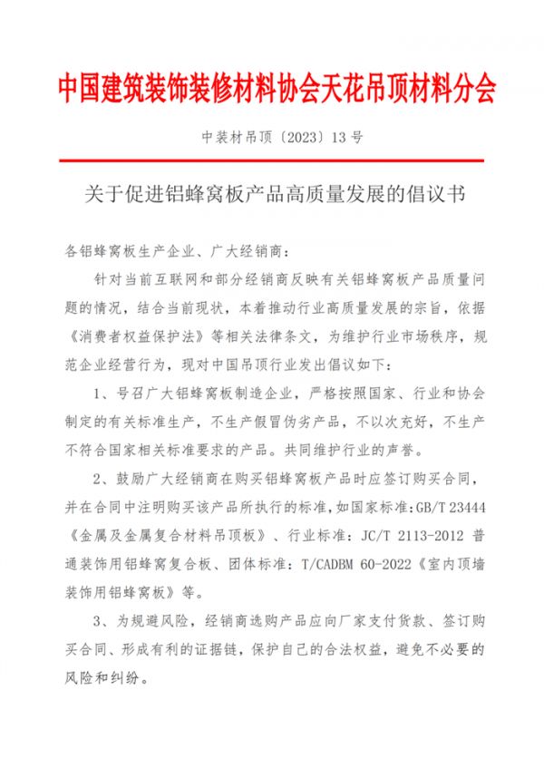 针对当前互联网和部分经销商反映有关铝蜂窝板产品质量问题的情况,为维护行业市场秩序,规范企业经营行为,中国建筑装饰装修材料协会天花吊顶材料分会对中国吊顶行业发出倡议如下: