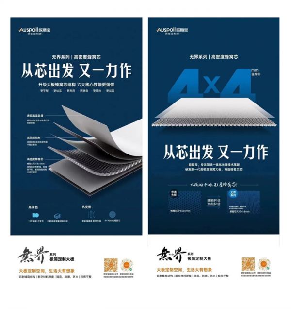 蜂窝大板的窝心边长规格从6 X 6mm,升级为4 x 4mm,在同等面积情况下,蜂窝芯骨架更密,同时升级配套龙骨及配件,产品性能优异,支撑力、稳定性更强,增强了板材的平整度和承重力,差异化更明显。