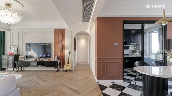 屋主是一对年轻夫妻,热爱生活,独具浪漫情怀,钟爱文艺的生活姿态~设计师基于屋主的审美意趣,在设计上很好地把握了色彩与内在的联系,将二人对法式的热忱衍生为空间主要情绪,同时利用开放式的空间结构、浅沙+红棕的大胆撞色以及随处可见的石膏线条、拱门元素等,营造出时尚典雅的悠然氛围,满足了屋主夫妻想要的“有个性有温度”的住家期待。公区用多乐士浅沙色大面积涂刷,局部做红棕色跳色,配合复古气息满满的木纹砖+黑白棋盘格地砖,营造浓郁的法式风情;书房打掉一半墙体,用石头纹玻璃隔断代替,通透朦胧的视觉效果既增添了美学氛围,也优化了采光。