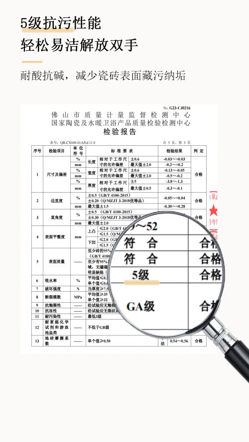 吸水率接近于0,拥有五级抗污性能,耐酸抗碱,减少瓷砖表面藏污纳垢