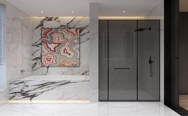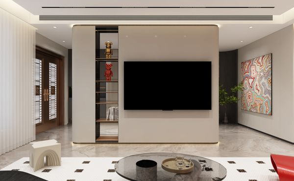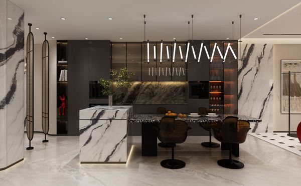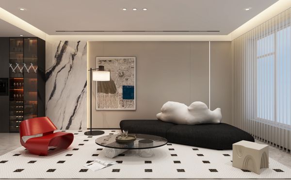 客厅以素雅为基底,摒弃繁冗的装饰,强调材质和工艺本身。瓷砖的泼墨形式与大理石的肌理仿佛呼应下层,在绿植与光影的点缀下,演绎多样层次,以简洁细致回应居住品味与审美追求。家具以弧线型的包裹感诠释舒适与温馨,红色的沙发与展示柜地灯光与背板相呼应,搭配黑白大理石的纹路背景,立体了空间的纵深记忆,呈现最纯粹的美感与力量、张扬与克制。